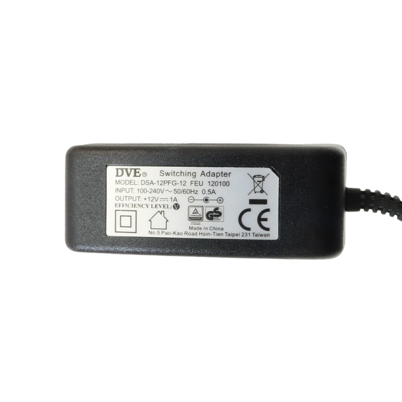 آداپتور 12 ولت 1 آمپر دیواری 12V-1A مارک DVE از نوع سوئیچینگ با سرفیش آداپتوری استاندارد 2.1mm  میباشد.