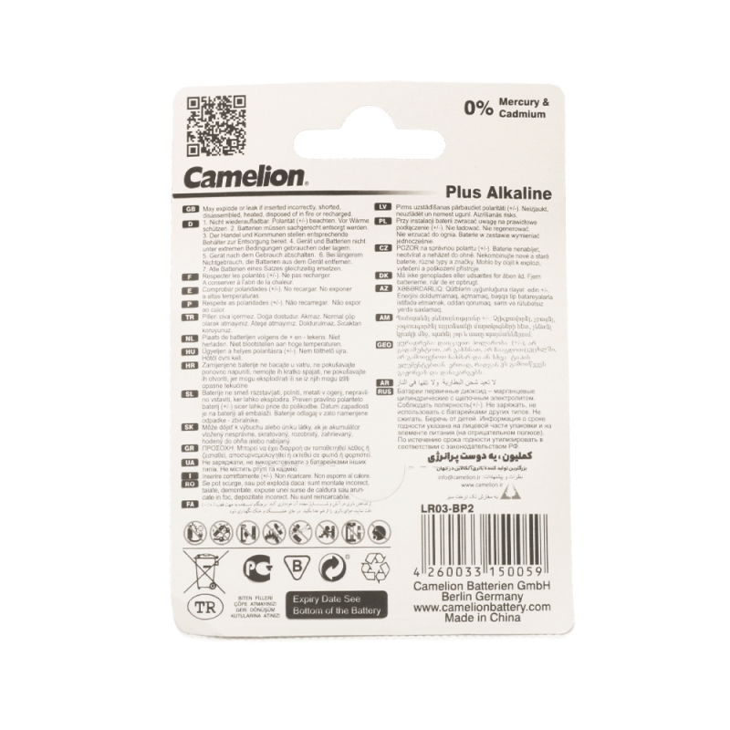 باتری نیم قلمی آلکالاین Plus Alkaline دوتایی مارک Camelion ، تکنولوژی به‌کار رفته در این باتری‌ها آلکالاین است و قابلیت شارژ مجدد ندارند؛ همچنین ویژگی اصلی باتری‌های آلکالاین، ماندگاری و دوام بالای آن‌هاست.