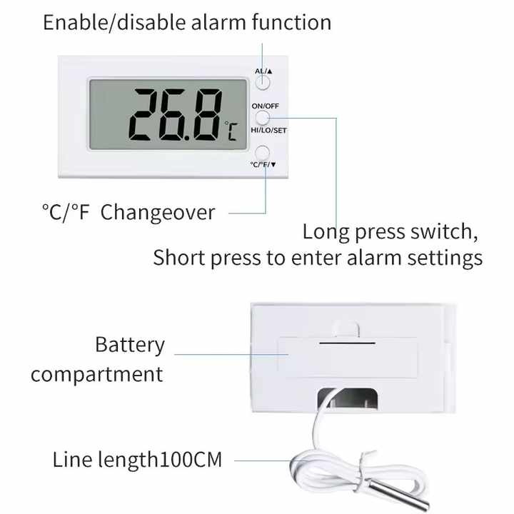 فاصله سنسور تا LCD یک متر است یعنی میتوان سنسور را تا یک متر از جایی که ال سی دی قرار دارد دورتر کرد. با این دماسنج میتوانید بیشترین و کمترین دمای مورد نظر خود وارد کنید و زمانی که دمای محیط از دمای مورد نظر شما کمتر یابیشتر شود، زنگ هشدار دماسنج فعال شده و شمارا باخبر سازد.