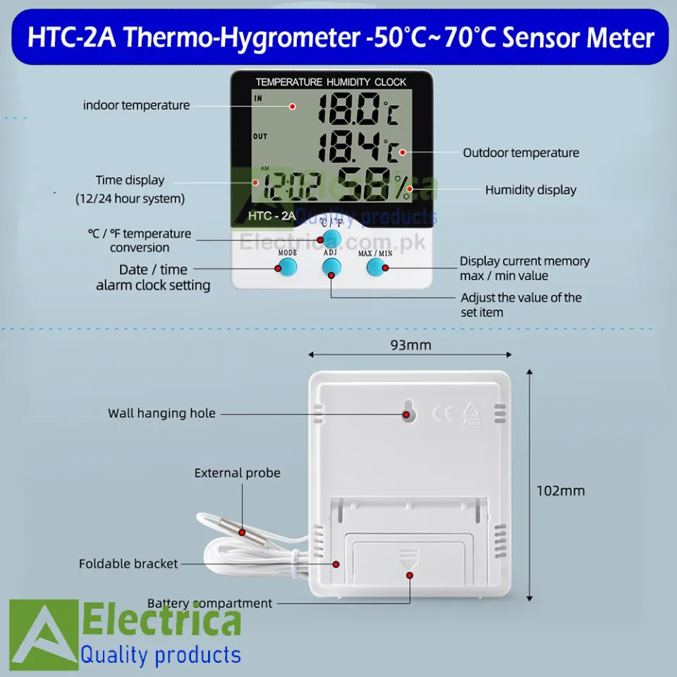 دماسنج و رطوبت سنج و ساعت رومیزی و دیواری مدل HTC-2A