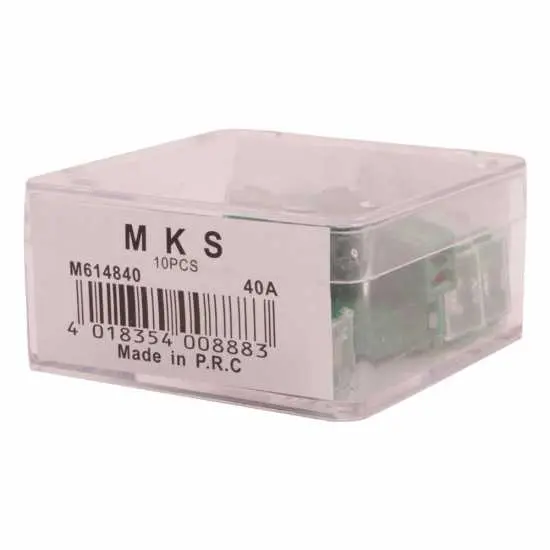 این کالا توسط شرکت MKS با بهترین مواد جهت مقاومت در برابر جریان و حرارت و ذوب تولید شده است،فیوز های ام کا اس دارای کیفیت بالا میباشند،این محصول به رنگ سبز به معنای چهل آمپر میباشد.