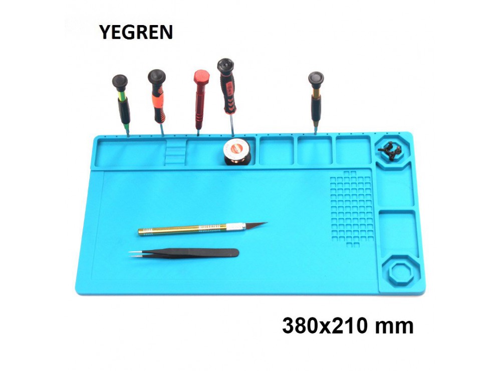 این صفحه مناسب برای کار مونتاژ و یا تعمیر موبایل و یا مونتاژ بردهای الکتریکی می باشد. جنس این صفحه از سیلیکون است و نسوز می باشد. دارای بخش های مختلف جهت نگهداری آی سی های SMD و دیپ ، لوازم مونتاژ ، صفحه ی برد PCB یا برد موبایل و …  می باشد. این پد نسوز 8 مکان مخصوص جای نگهداری پیچ و قطعات را دارد. همچنین دارای خط کش 25cm است.