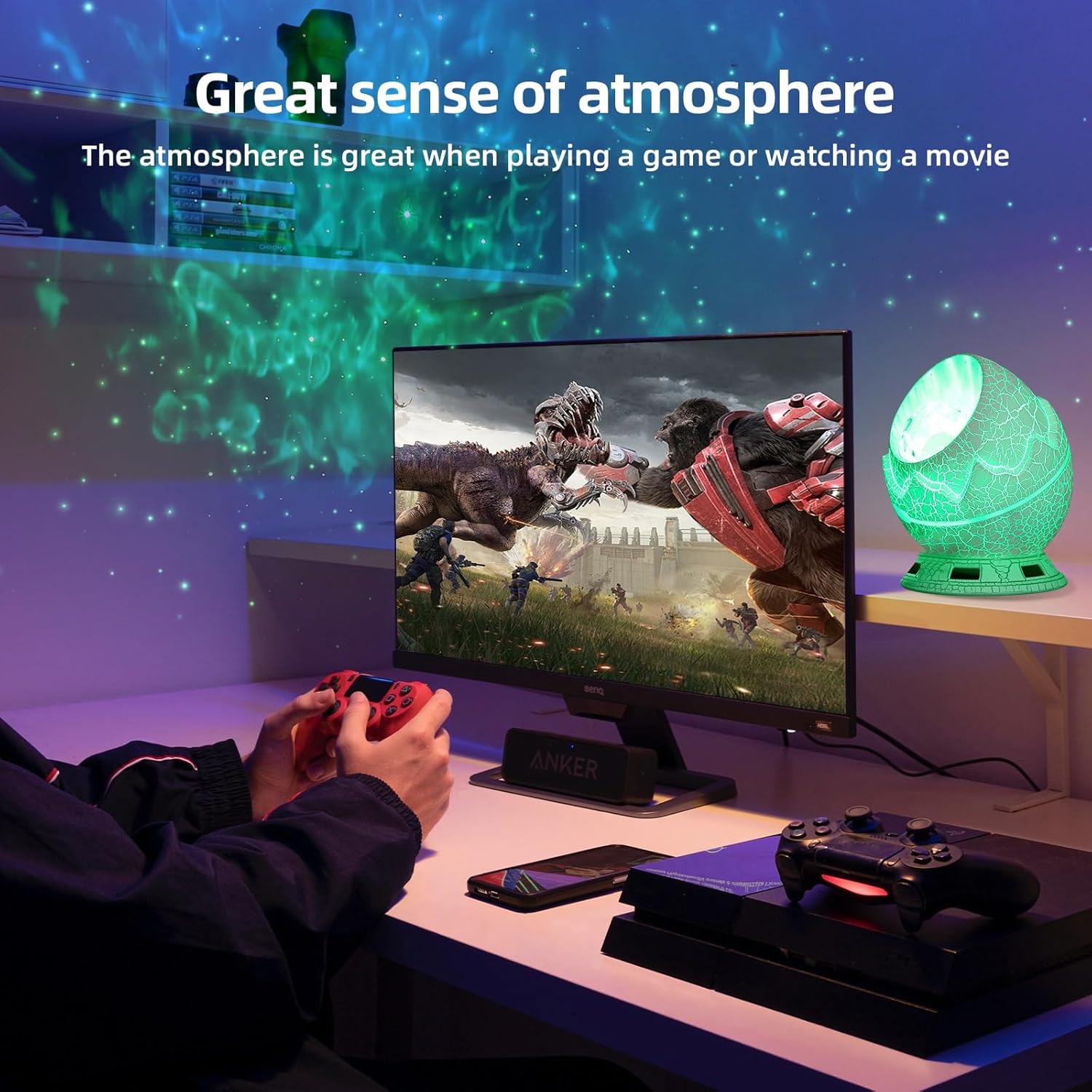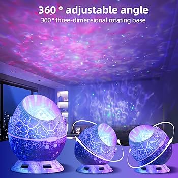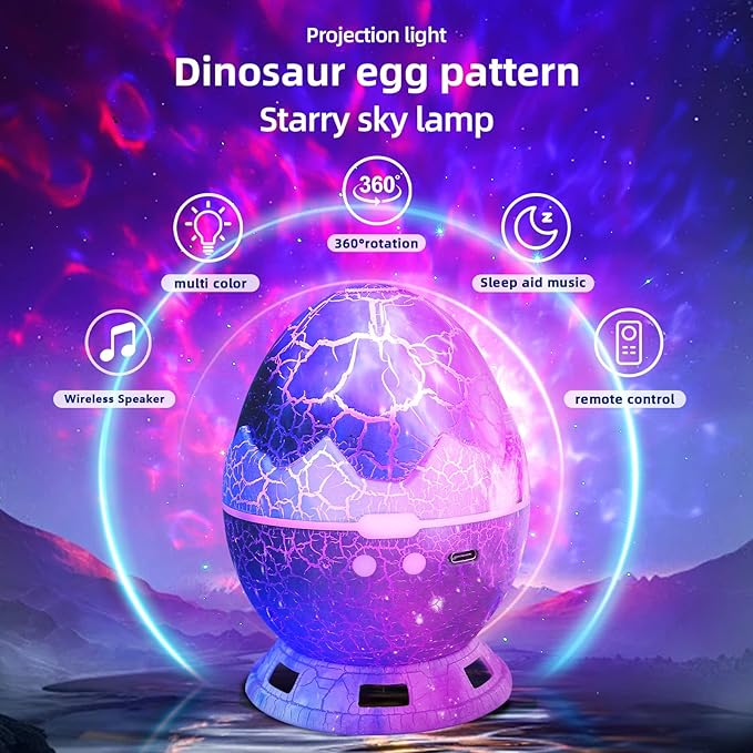 اثر نورپردازی سحابی این پروژکتور نور ستاره علاوه بر اینکه یک لامپ دکور تخم دایناسور است، می‌تواند ستارگان و افکت‌های نور کهکشان را نیز نمایش دهد. نور رنگی متشکل از قرمز، سفید، آبی و سبز است و می‌توان آن را با هم ترکیب کرد تا 14 افکت نوری مختلف را ایجاد کرد. می توانید سرعت و روشنایی افکت نور را با کنترل از راه دور موجود تنظیم کنید. نور و تایمر شب شما می توانید آزادانه زاویه را تنظیم کنید، می توانید به راحتی چرخش افقی 360 درجه و زاویه تابش عمودی 90 درجه را تنظیم کنید و زاویه مورد نظر خود را انتخاب کنید و نور شب پروژکتور را در جهات مختلف انتخاب کنید. می توانید یک تایمر تنظیم کنید تا پروژکتور بعد از 1 یا 2 ساعت خاموش شود. اگر فراموش کردید تایمر را تنظیم کنید و به خواب رفتید نگران نباشید زیرا پروژکتور پس از 4 ساعت به طور خودکار خاموش می شود. 19 نویز سفید این پروژکتور نور شب پر ستاره دارای حداکثر 19 صدای نویز سفید برای انتخاب است. با سفارشی کردن روشنایی نور شب و انتخاب صدای سفید مناسب برای آرام کردن خواب کودک، کودک نوپا، بچه بزرگ یا نوجوان خود، خواب بهتری را در شب تشویق کنید. کنترل صوتی  و  جلوه پروژکتور نور کهکشانی مطابق با ریتم موسیقی حرکت می کند. شما همچنین می توانید نورها را با صدای خود یا با کف زدن یا با صدا کنترل کنید.