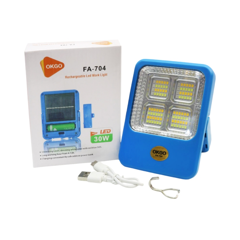پروژکتور خورشیدی شارژی سیار مولتی فانکشن WORK LIGHT مدل FA-704 دارای طراحی مناسب و قدرت زیاد روشنایی و همچنین خاصیت ضد آب و رطوبت است.