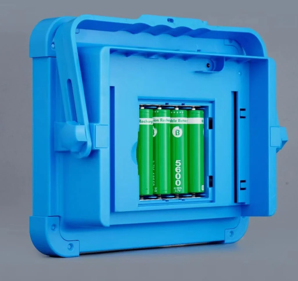 پروژکتور 100W ، دارای 4 باتری لیتیوم یون شارژی که به آسانی قابل تعویض نیز می باشد ، بوده و پنل دستگاه با 3 متر کابل ، و فیش به آن متصل می شود . با دارا بودن پورت USB ، این دستگاه ، پاور بانک خورشیدی نیز می باشد که البته دستگاه را می توان با شارژر موبایل نیز شارژ کرد .