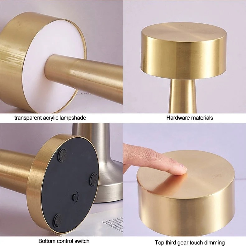 چراغ آباژور رومیزی رستورانی HSF شارژی رنگ طلایی لمسی دیمر دار با نور سفید مهتابی و سفید آفتابی که با لمس کردن قسمت بالایی، روشن و خاموش می‌شود و نور لامپ آن تغییر رنگ می‌دهد.
