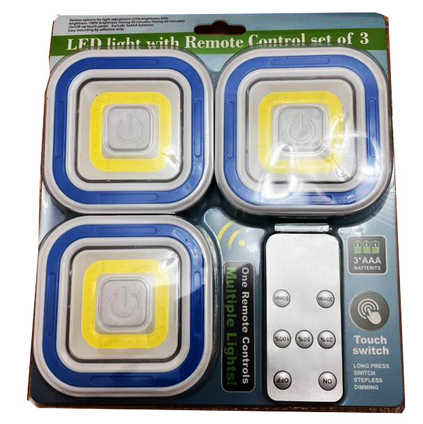 چراغ زیر کابینتی و سقفی COB ریموتی تایمردار باتری خور سه عددی ، پک لامپ LED شامل سه عدد لامپ اضطراری LED به علاوه یک ریموت کنترل است که میتوان آن را روی سقف یا زیر کابیت و یا دیوار نصب کرد و هنگام قطع برق به عنوان چراغ اضطراری از نور آن بهره برد. این لامپ ها هر کدام با سه عدد باطری نیم قلمی AAA (داخل پک نمیباشد)کار میکنند و توسط دکمه روشن خاموش روی لامپ و یا ریموت همراه آن قابل کنترل است. یکی از مزایای چراغ اضطراری سقفی دیواری ریموت دار مدل 3in1 داشتن حالت 30 دقیقه‌ و 60 دقیقه است. به این صورت که با فعال شدن این حالت، چراغ ها بعد از این زمان ها به طور خودکار خاموش می‌شوند. همچنین شدت نور لامپ ها در سه نوع 25% 50% و 100% قابل تغییر است.